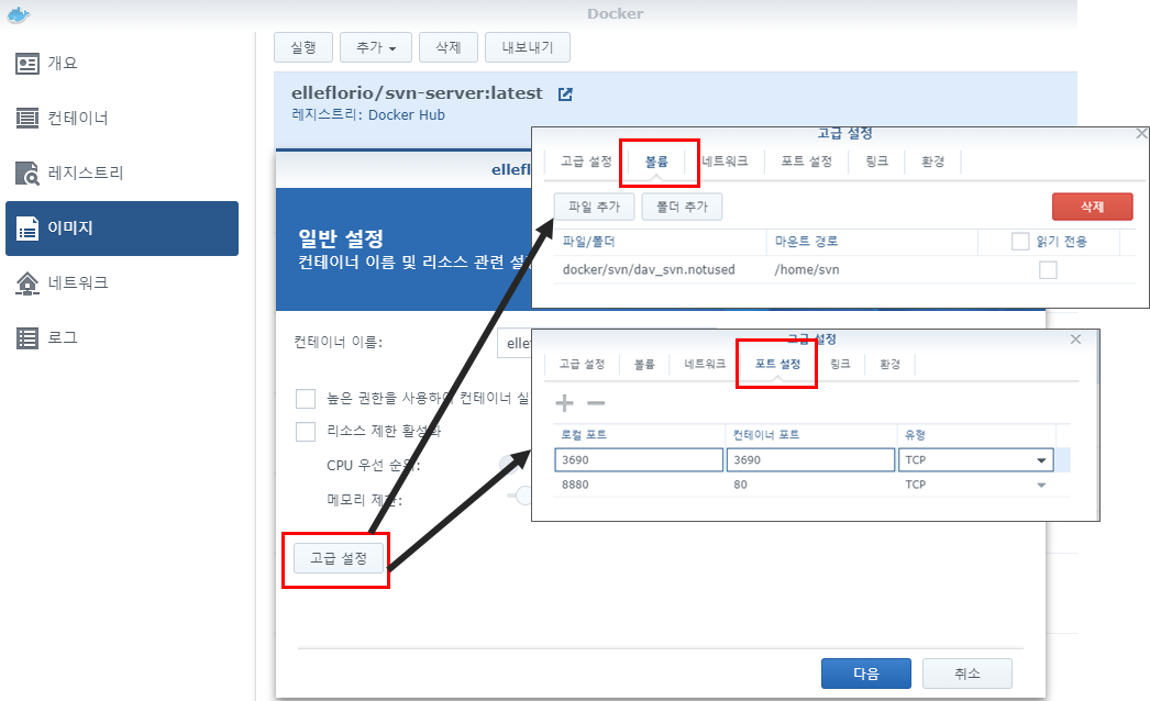 - Docker -> 이미지 -> elleflorio/svn-server:latest 선택 -> 실행 버튼 클릭 또는 이미지 더블클릭 후 고급설정으로 진입한다.